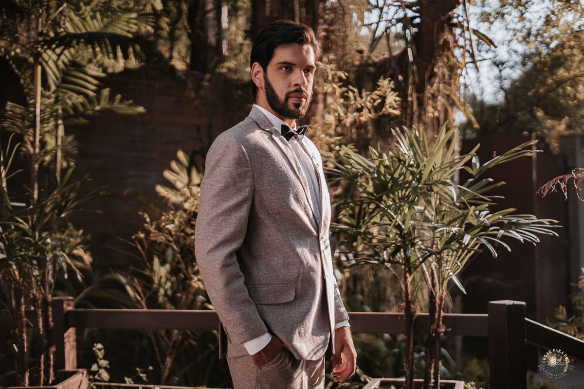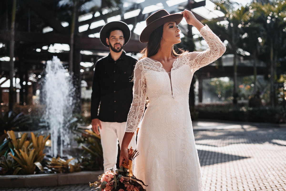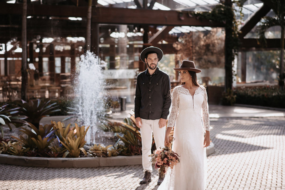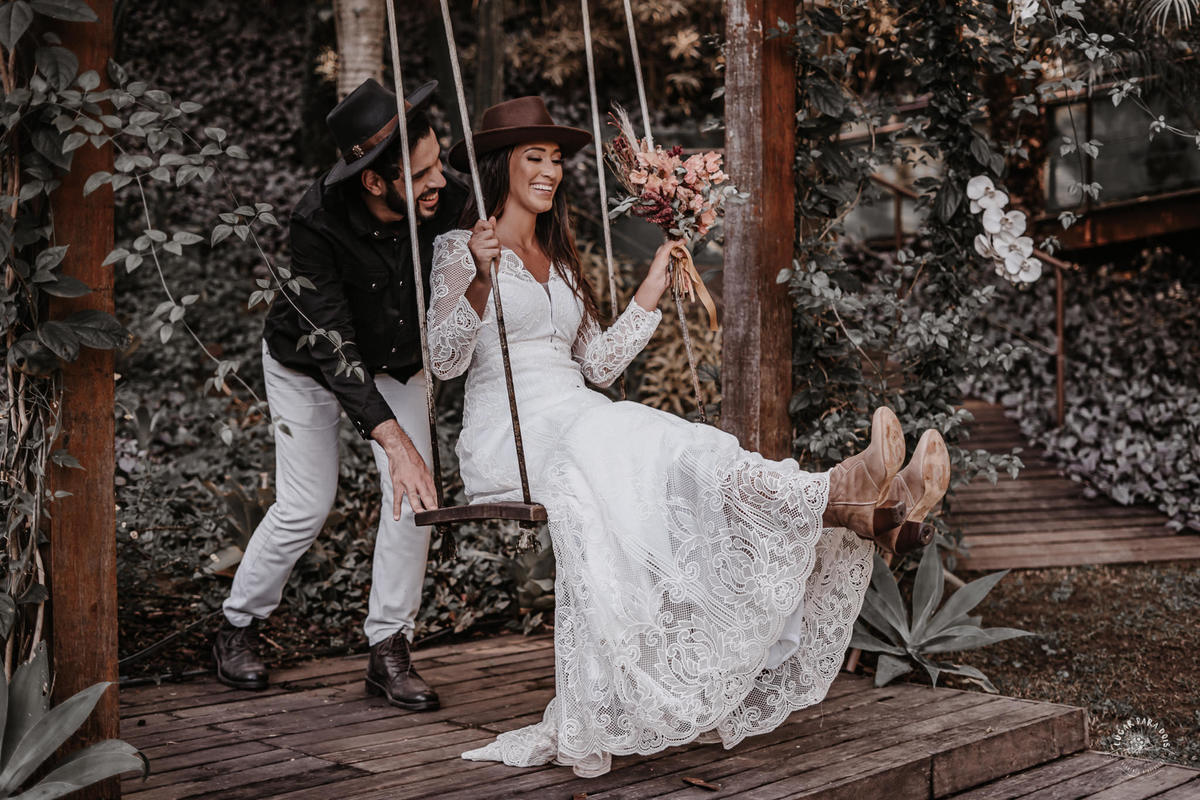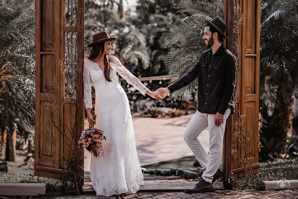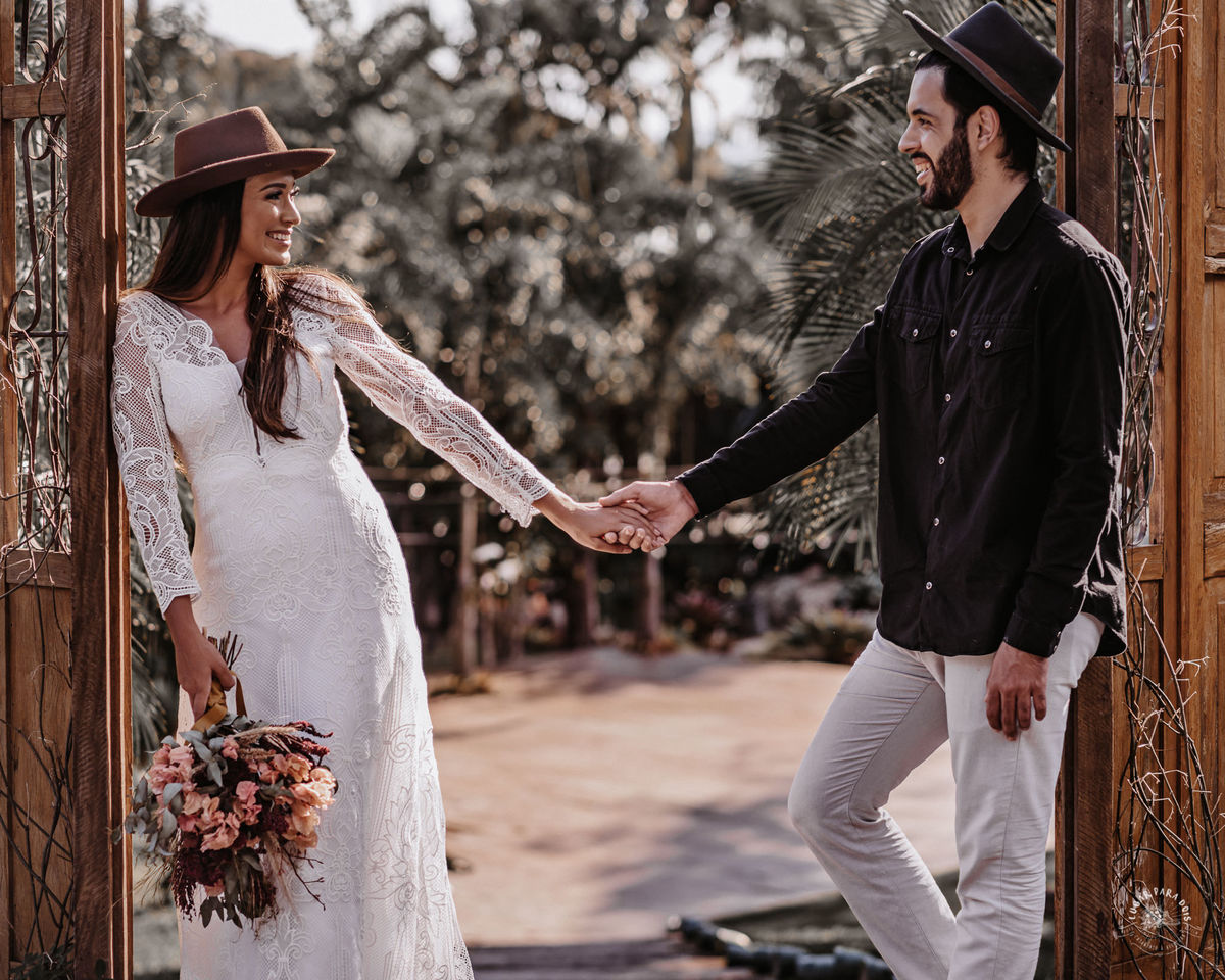 Esta inspiração aparece no vestido da noiva, que costuma ser um vestido romântico, em tecidos mais fluidos, leves e rendas. O noivo pode fugir do tradicional e ousar para algo mais despojado e alegre; barba, suspensórios, gravata borboleta e chapéus, são alguns itens interessantes.